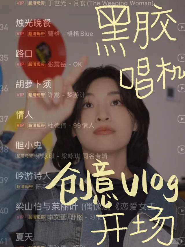 Vlog开场是影响完播率的关键环节,黑胶唱机自带复古文艺氛围,'All In One'暗示产品推荐,创意开场是创作者持续追求的差异化内容 |
