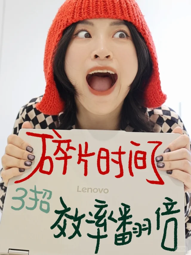 封面在Lenovo笔记本上手写'碎片时间了 3招效率翻倍',把产品植入和内容主题自然融合;夸张惊讶表情是她的标志;系统标题用emoji强化碎片化概念。商单内容的自然植入范本。 |