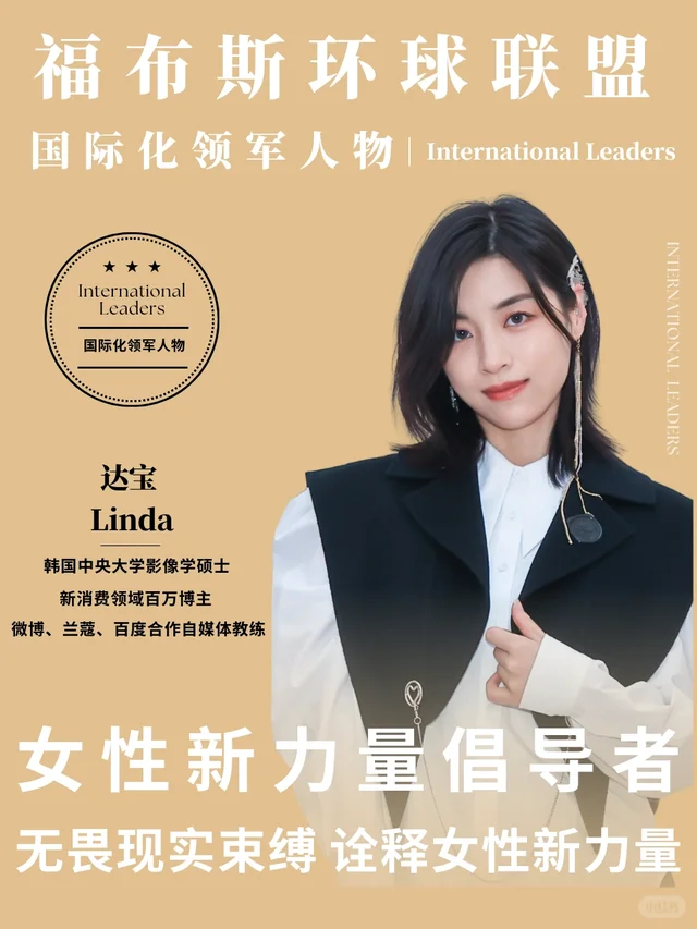 福布斯环球联盟 国际化领军人物 International Leaders 达宝 Linda 韩国中央大学影像学硕士 新消费领域百万博主 微博、兰蔻、百度合作自媒体教练 女性新力量倡导者 无畏现实束缚 诠释女性新力量 |