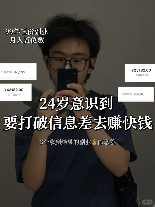 99年三份副业 月入五位数 订单金额¥6,299 ¥23182.00当月现金收入 ¥43182.00当月现金收入 订单金额¥5,040 24岁意识到 要打破信息差去赚快钱 3个拿到结果的副业💰信息差 |