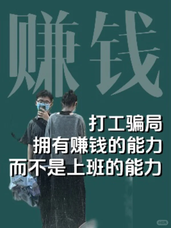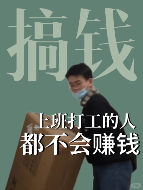 核心观点极度鲜明:赚钱≠上班,用'真相'二字做超大字体视觉锤,搬箱子的照片暗示体力劳动/打工的辛苦对比 |